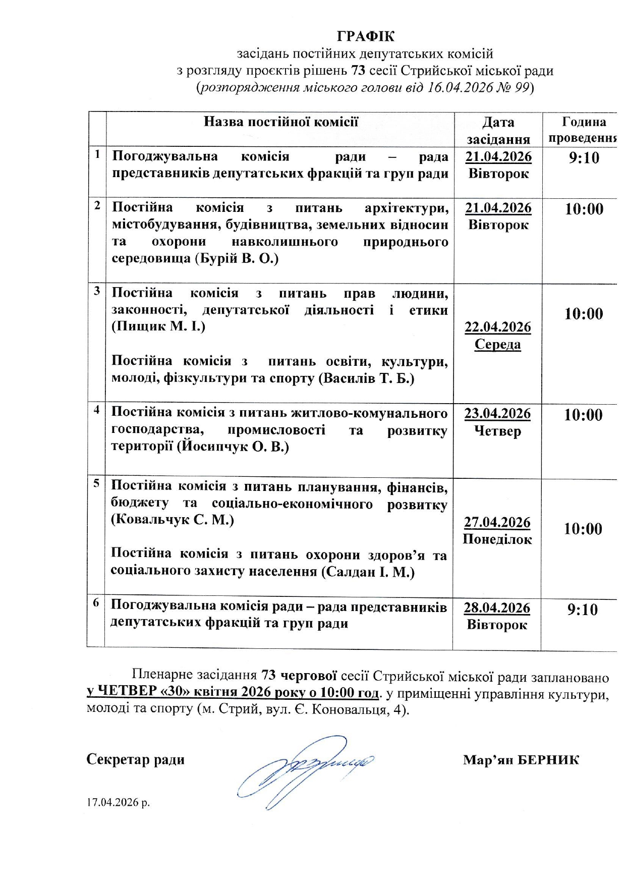 Графік засідань постійних депутатських комісій з розгляду проєктів рішень 73 сесії Стрийської міської ради