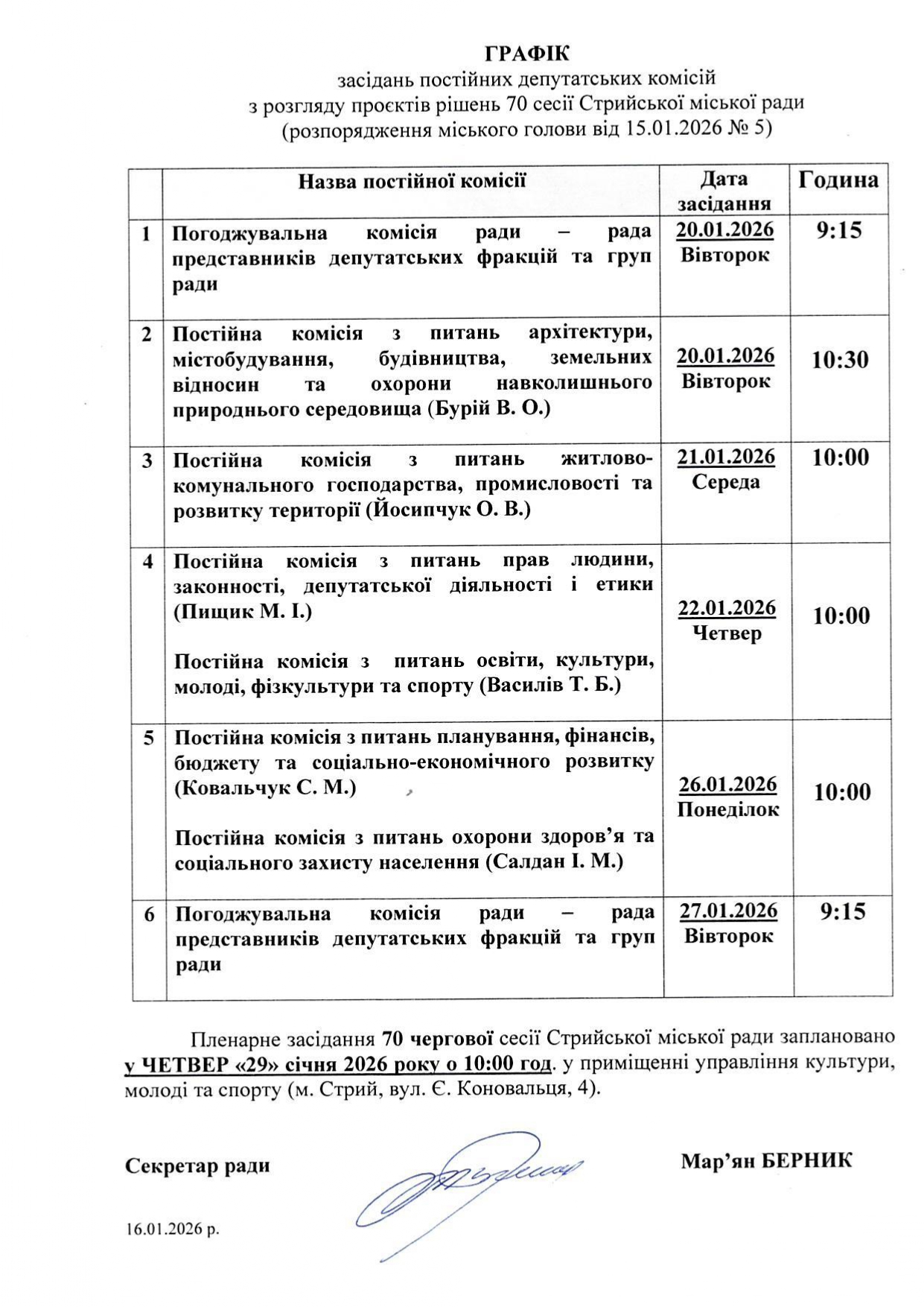 Графік засідань постійних депутатських комісій з розгляду проєктів рішень 70 сесії Стрийської міської ради