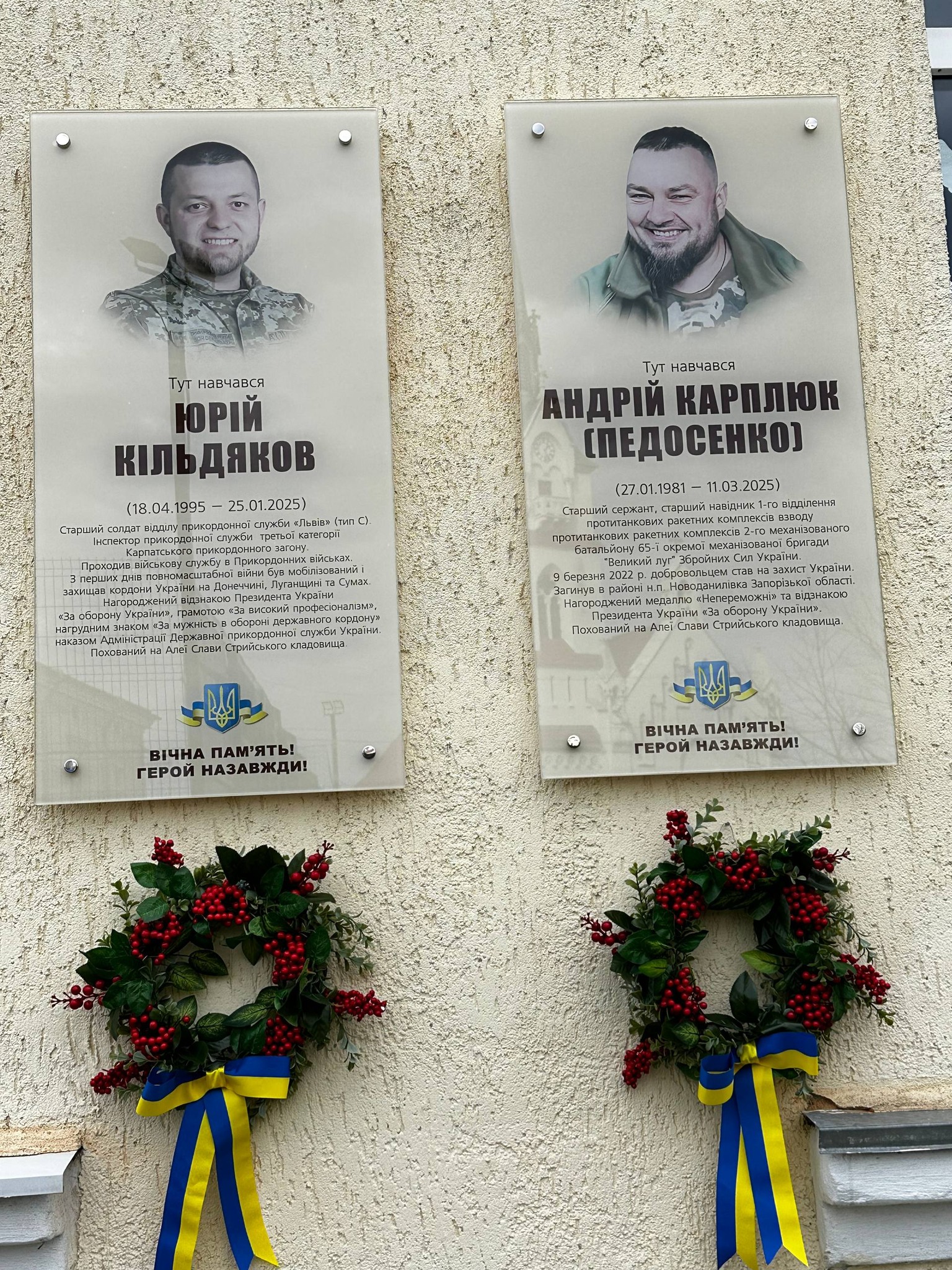 Вчора на фасаді Стрийської гімназії №7 урочисто відкрили та освятили пам’ятні дошки трьом Героям, які в різні роки тут навчались: Юрію Кільдякову, Владиславу Будинкевичу, та Андрію Карплюку. На урочистому заході були присутні родичі загиблих Захисників, представники влади, учні та вчителі. Священнослужителі освятили пам’ятні дошки. Пам’ять Героїв вшанували хвилиною мовчання та покладанням квітів. Тепер кожен, хто проходитиме біля цих пам’ятних дошок, зможе віддати шану Юрію, Владиславу та Андрію і подякувати за захист та хоробрість.