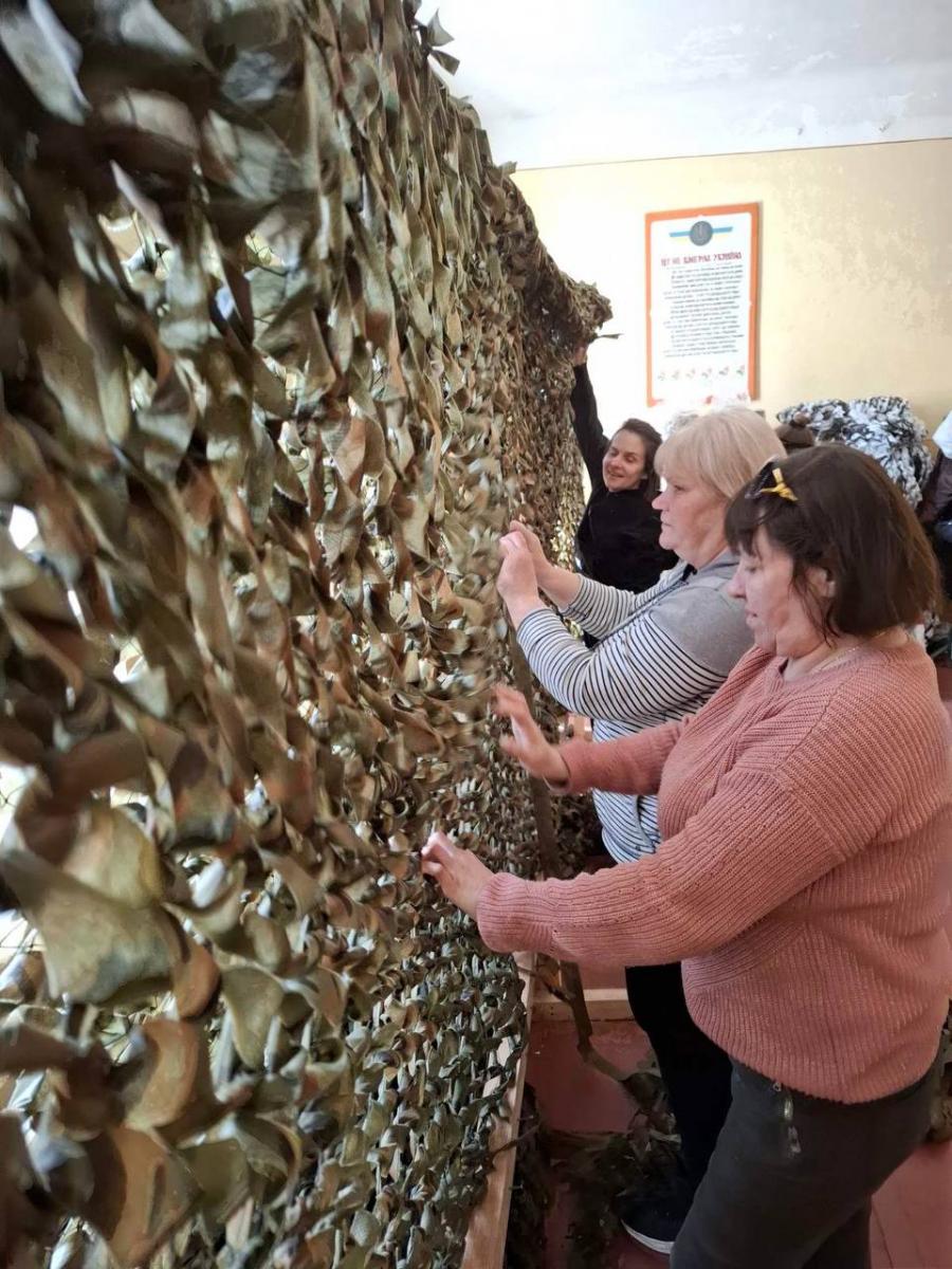У Стрийській ТГ робота кипить щодня. Завдяки співпраці служби зайнятості та КУ Стрийської міської ради «Будинок воїна», БФ «Фонд громад «РІДНЯ», БО «Благодійний фонд Олени Скоблик» безробітні мешканці громади долучилися до суспільно корисних робіт та виготовляють маскувальні сітки – «невидимки» для прикриття військової техніки та позицій. Це кропітка праця: потрібно правильно “під сезон” підібрати кольори , нарізати тканину та вплести її так, щоб створити ілюзію природного ландшафту.