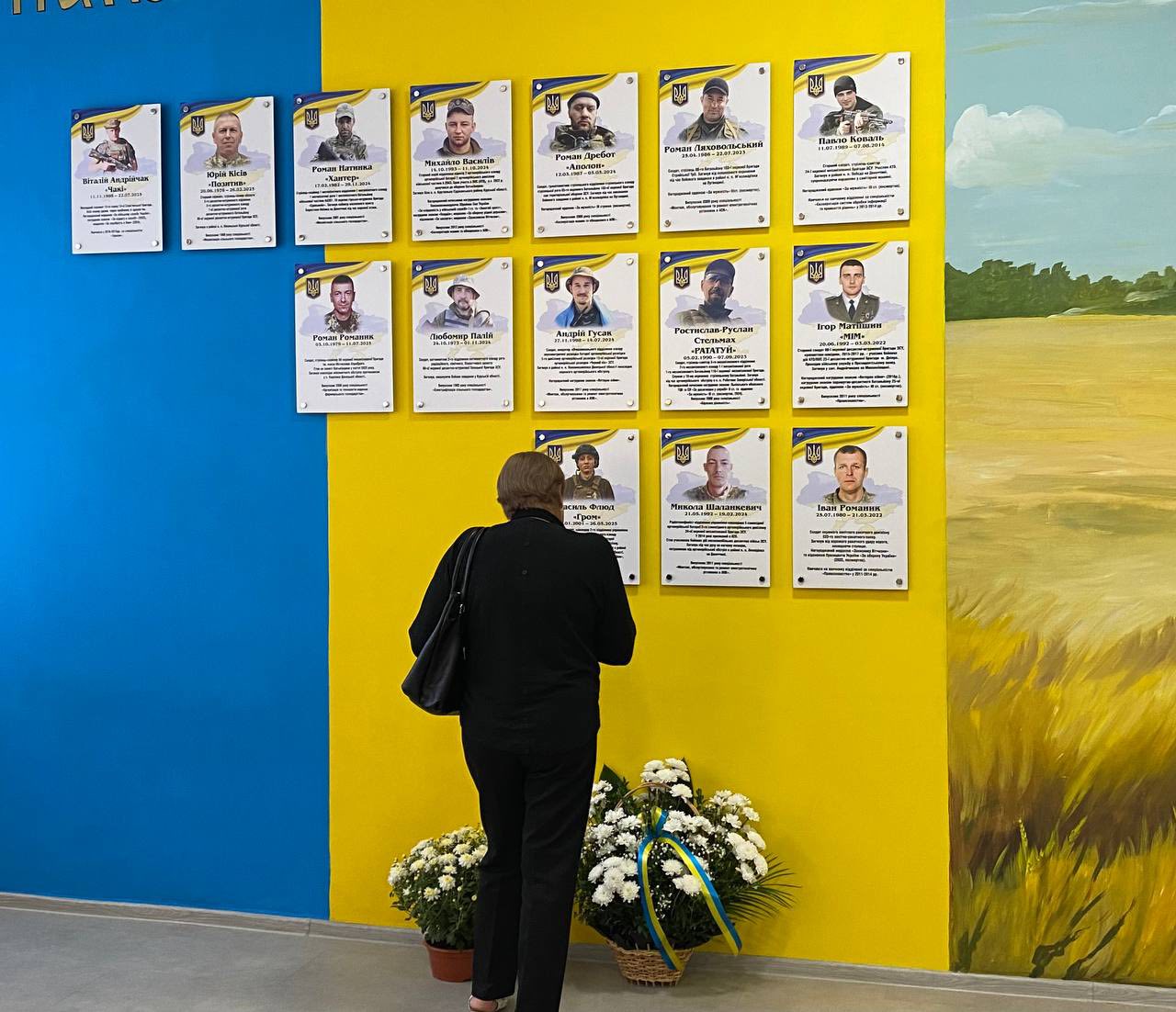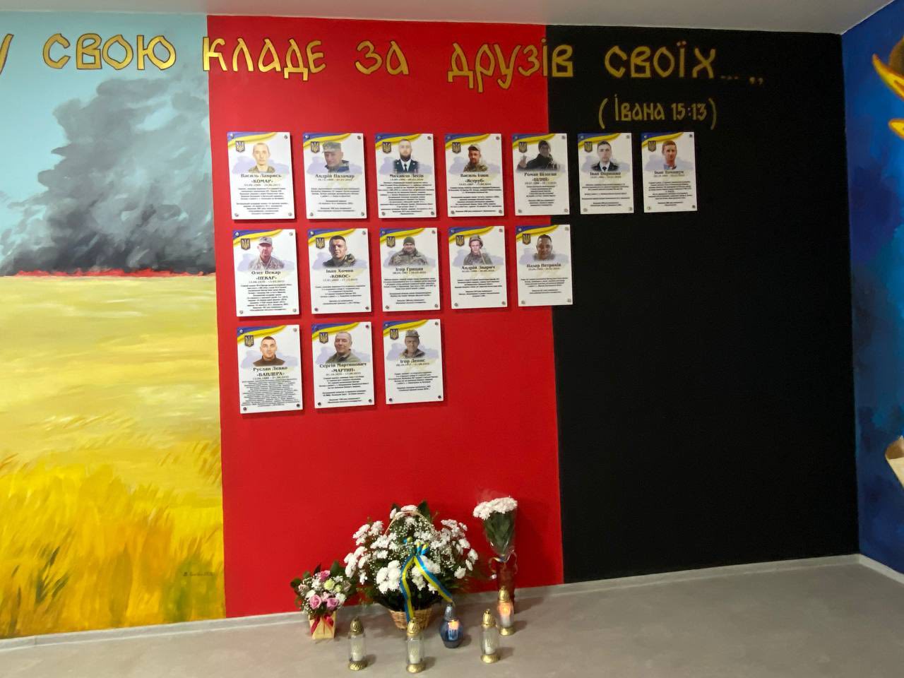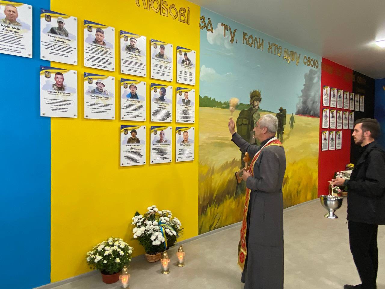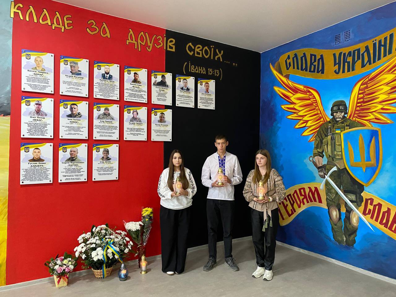 Мистецько-патріотичне оформлення Стіни пам‘яті виконав ветеран та художник Василь Бичко.