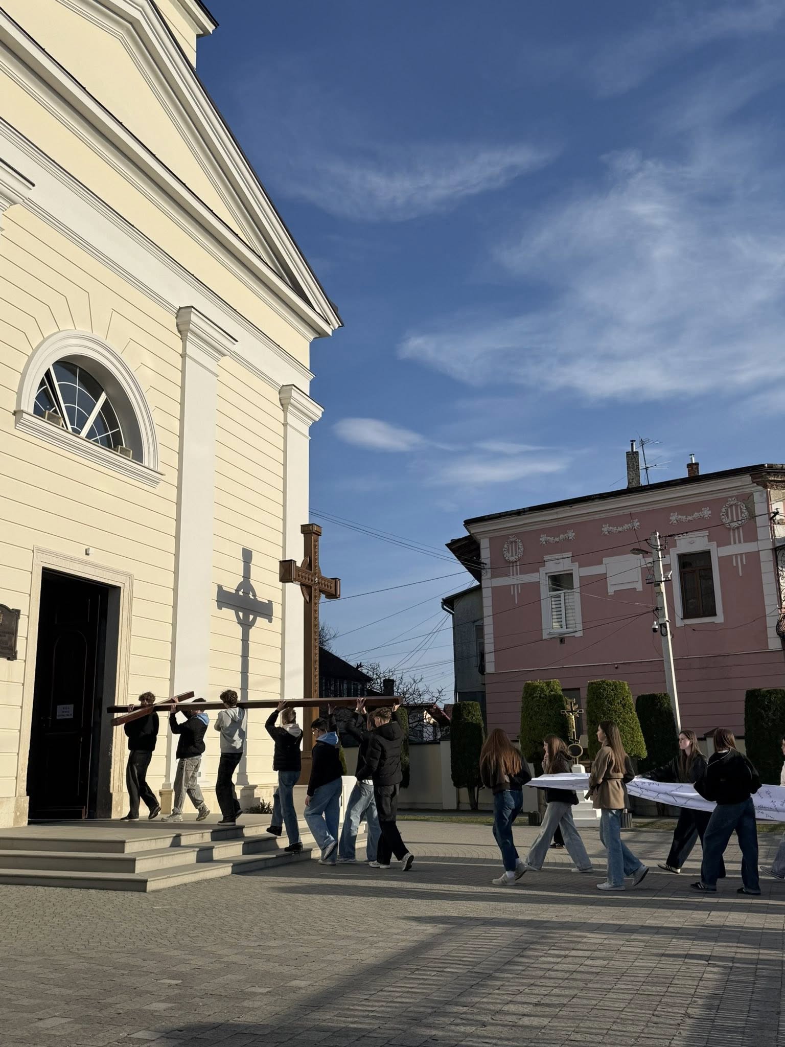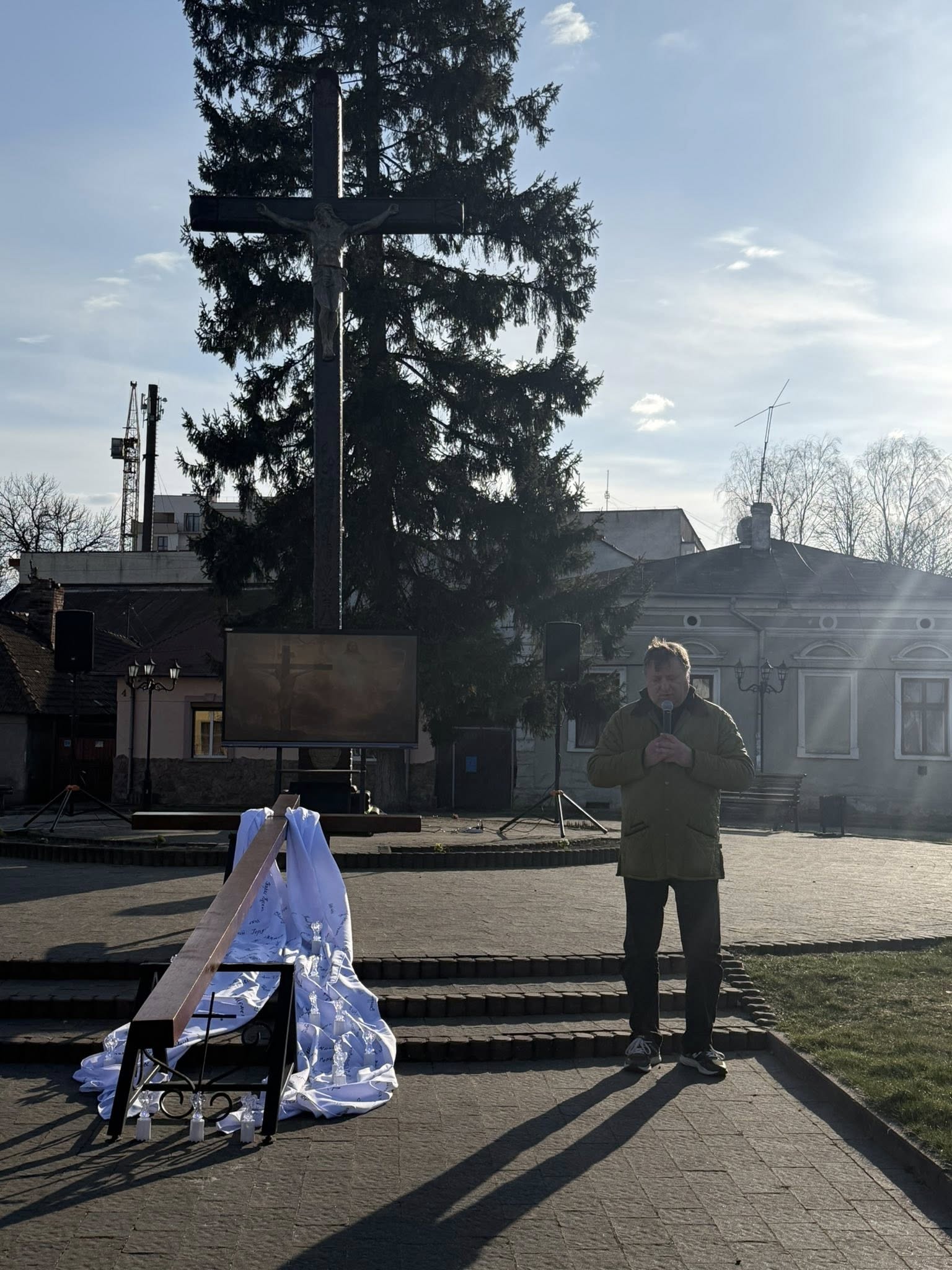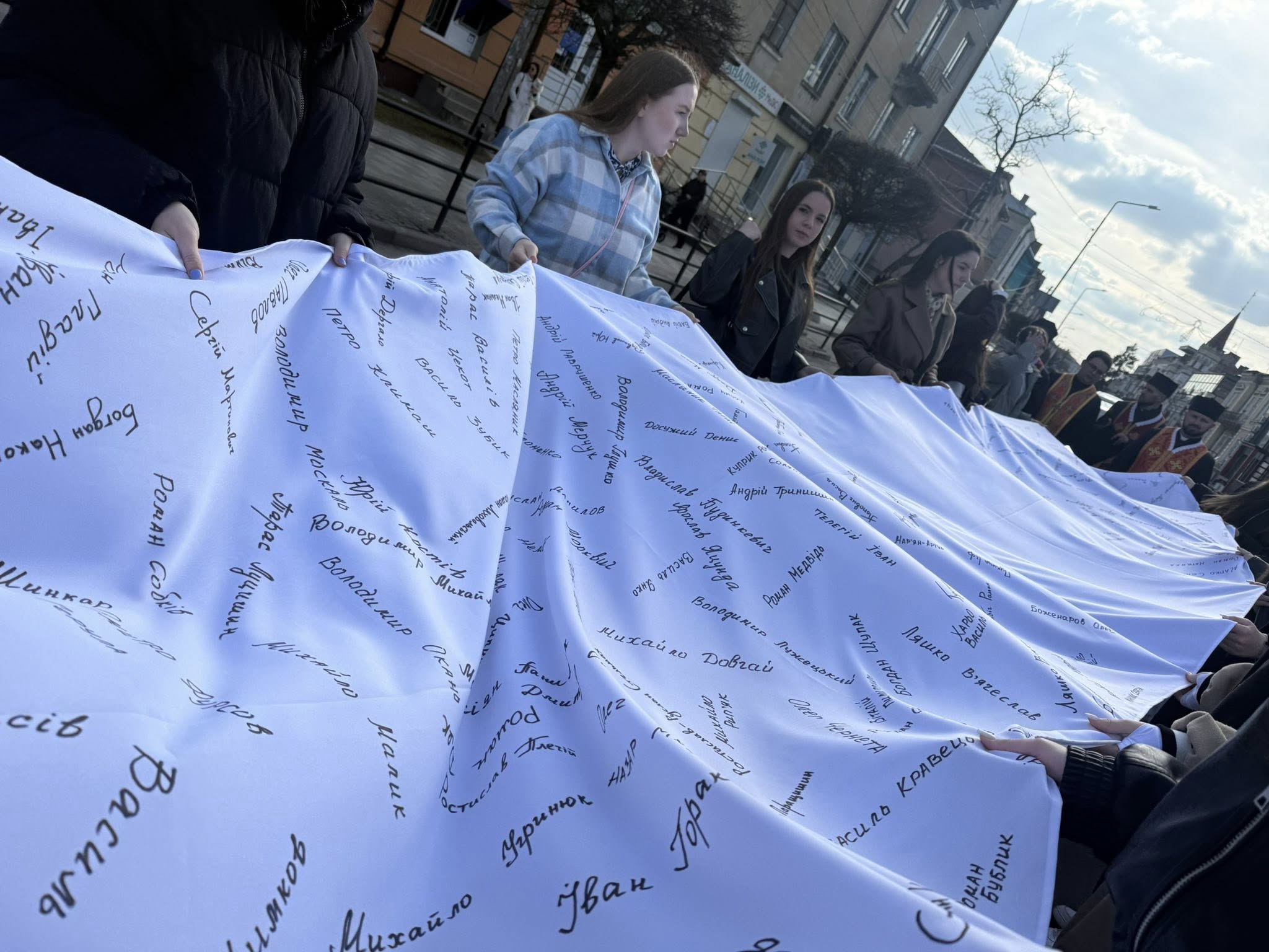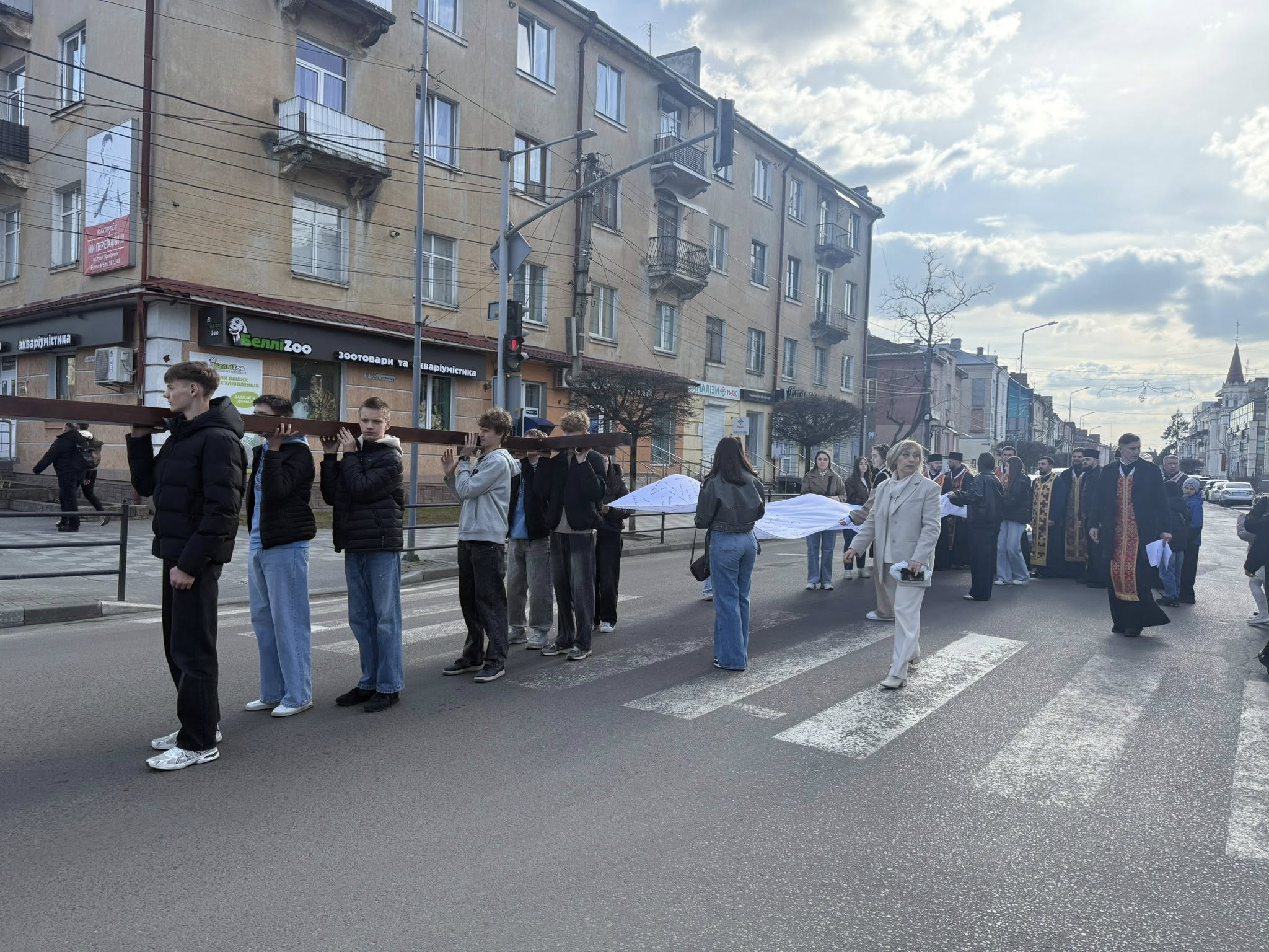 Після благословення владики Тараса Сеньківа, молодь Стрийської єпархії взяла на свої руки дерев’яний хрест та полотнище з іменами загиблих Героїв і молились стації в наміренні за всіх, хто постраждав у сучасній війні.